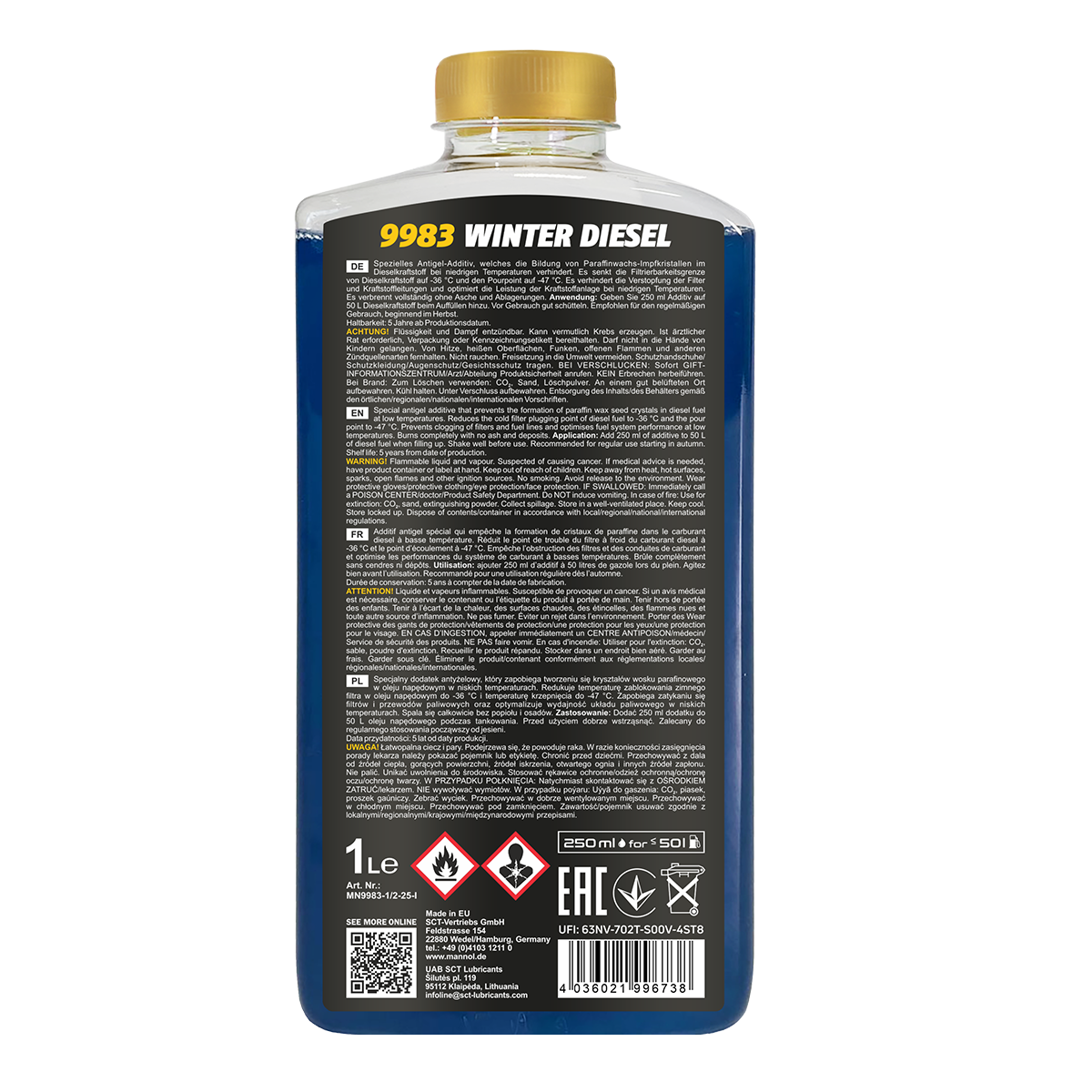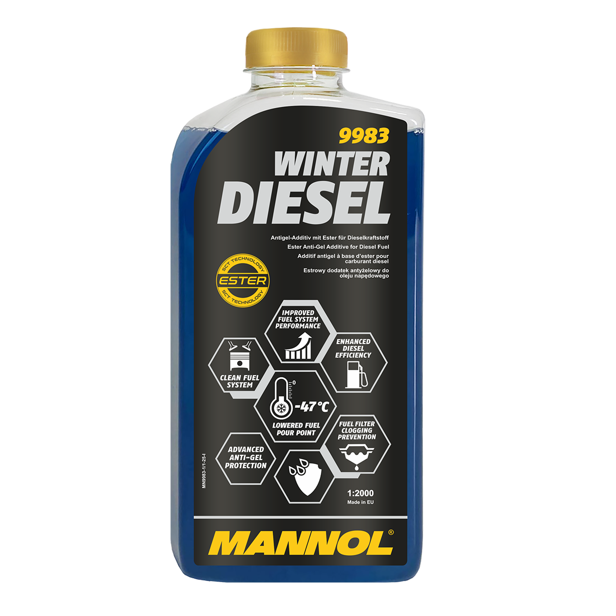 MANNOL Winter Diesel – a special anti-gel additive developed using a unique technology to reduce the pour point (gelation) and the maximum filterability temperature of both summer and winter diesel fuel grades. It is suitable for any type of diesel fuel and all types of diesel engines (atmospheric and turbocharged) with any fuel systems, equipped and not equipped with diesel particulate filters and catalysts. It does not change the basic properties of the fuel, only improves its low-temperature characteristics.