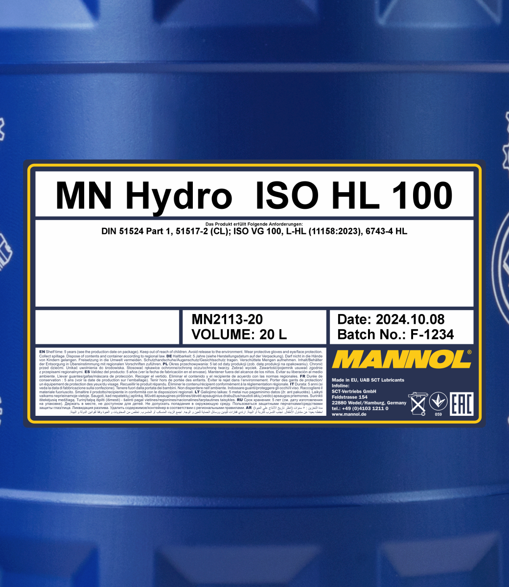 MANNOL Hydro ISO 100 is a high-viscosity mineral hydraulic oil designed for hydraulic equipment of stationary and mobile machinery operating at standard and high operating temperatures. Developed to meet the requirements of industrial hydraulic systems operating at high loads, pressures, temperatures and/or speeds.