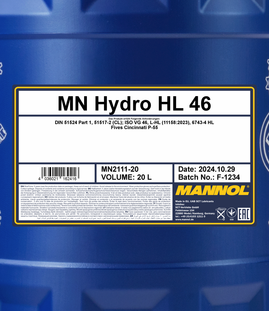 MANNOL Hydro ISO 46 is a medium viscosity mineral hydraulic oil designed for hydraulic equipment of stationary and mobile machinery operating at standard and high operating temperatures. Developed to meet the requirements of industrial hydraulic systems operating at high loads, pressures, temperatures and/or speeds.