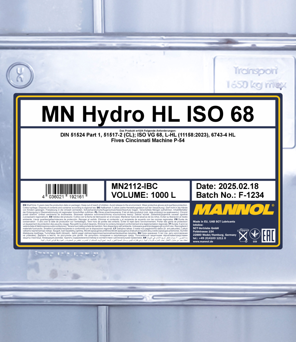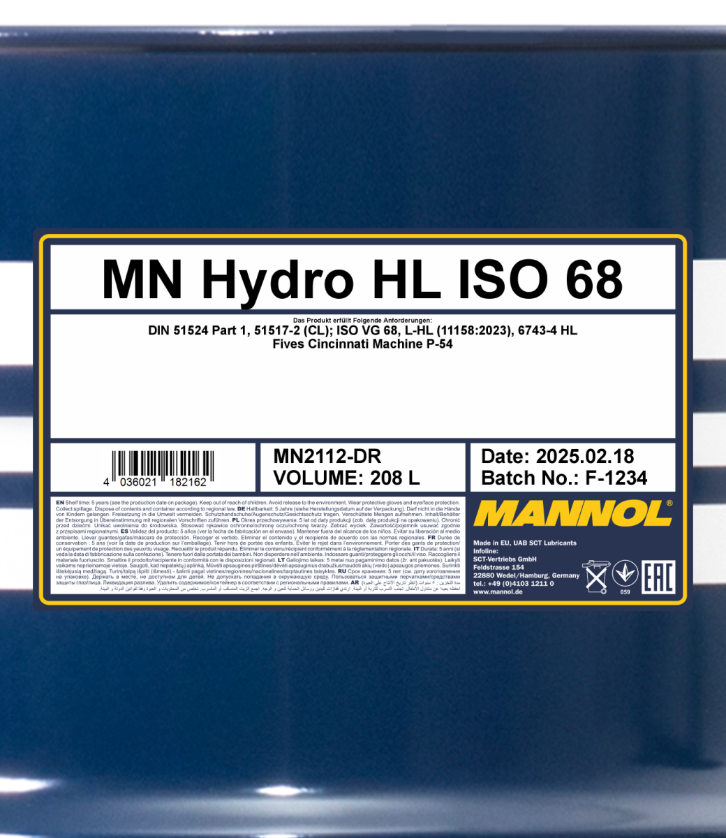MANNOL Hydro ISO 68 is a medium viscosity mineral hydraulic oil designed for hydraulic equipment of stationary and mobile machinery operating at standard and high operating temperatures. Developed to meet the requirements of industrial hydraulic systems operating at high loads, pressures, temperatures and/or speeds.