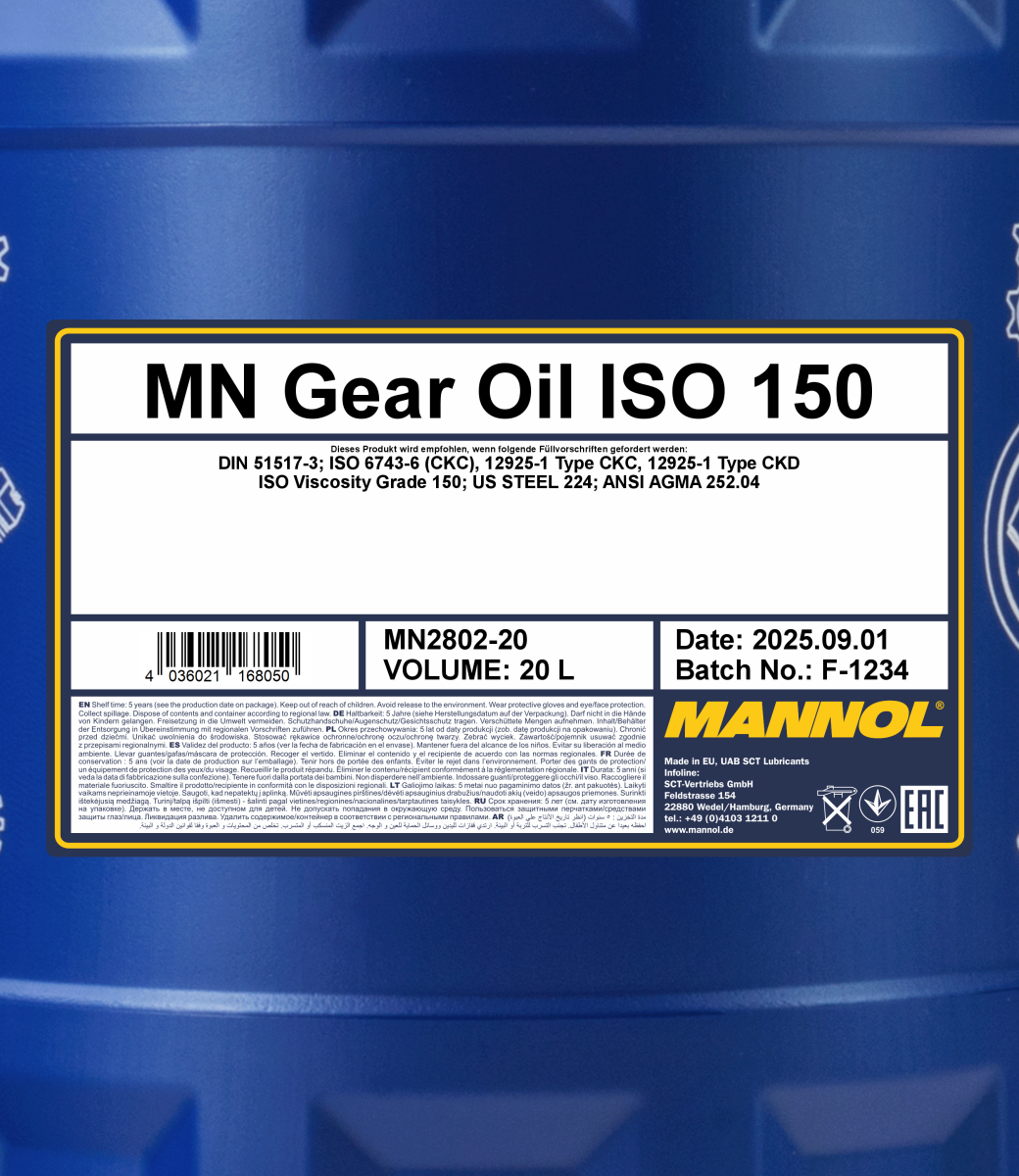It is recommended for industrial closed gear wheels (reducers), lubricated by circulation or spraying (oil mist), especially when there are heavy loads and high temperatures, vibrations, high speed and sliding friction. It may be used for lubricating various mechanisms and separate parts that operate under heavy loads: all types of gear systems (including worm and screw), clutches and all types of bearings: roller, friction, etc., where the required level of operating properties is DIN 51517 Part 3 CLP and viscosity is ISO VG 150.