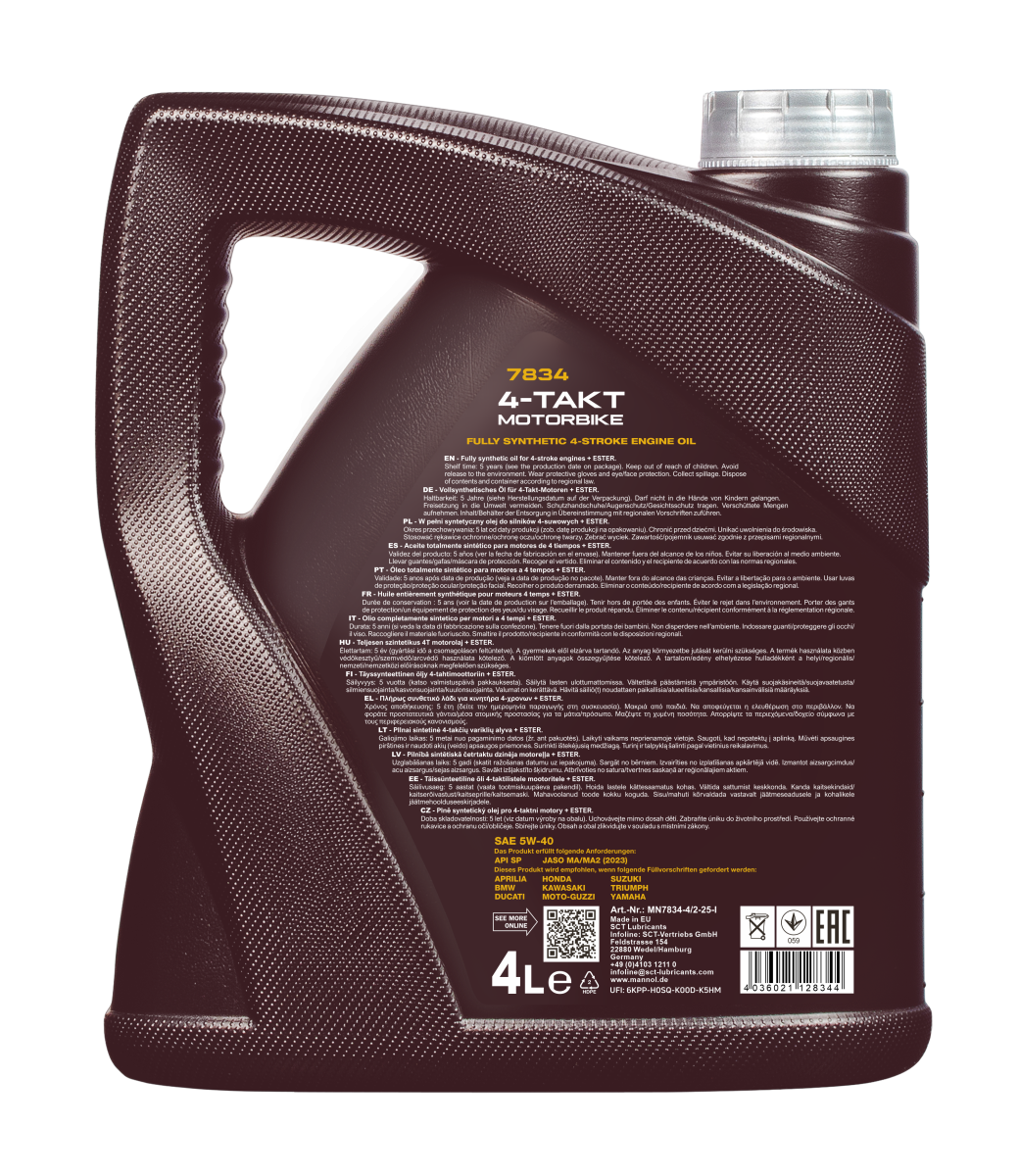 Designed for four-stroke petrol engines of all types of motorcycles, ATVs (ATV, UTV, SxS), personal watercraft (PWC), snowmobiles, scooters, and mopeds with air or liquid cooling, with both integrated and non-integrated gearboxes, with wet and dry clutch systems, and other motorcycle equipment with or without catalytic converters, where API SP or lower and JASO MA/MA2 performance levels are required. Ideal for fuel-injected engines.