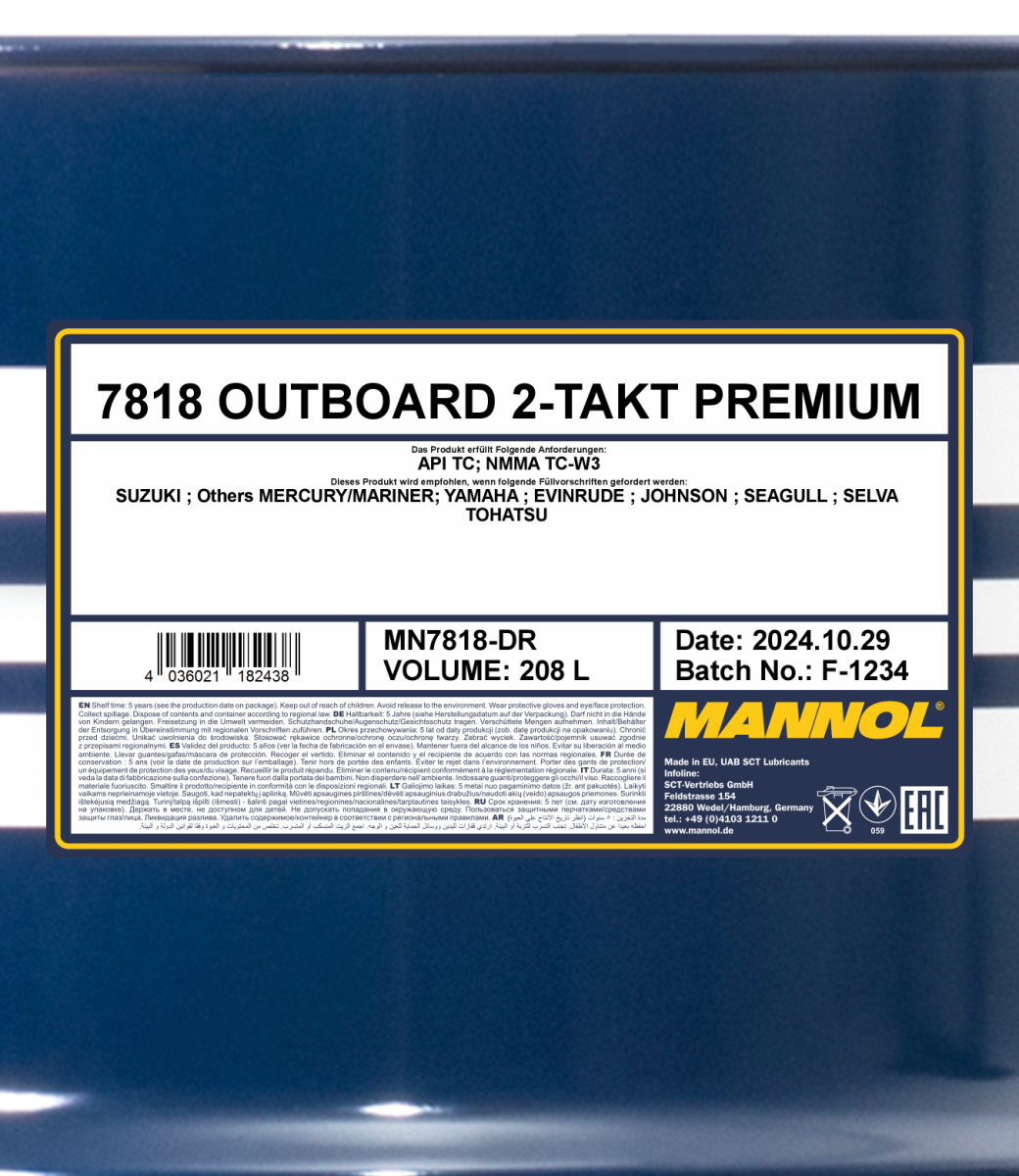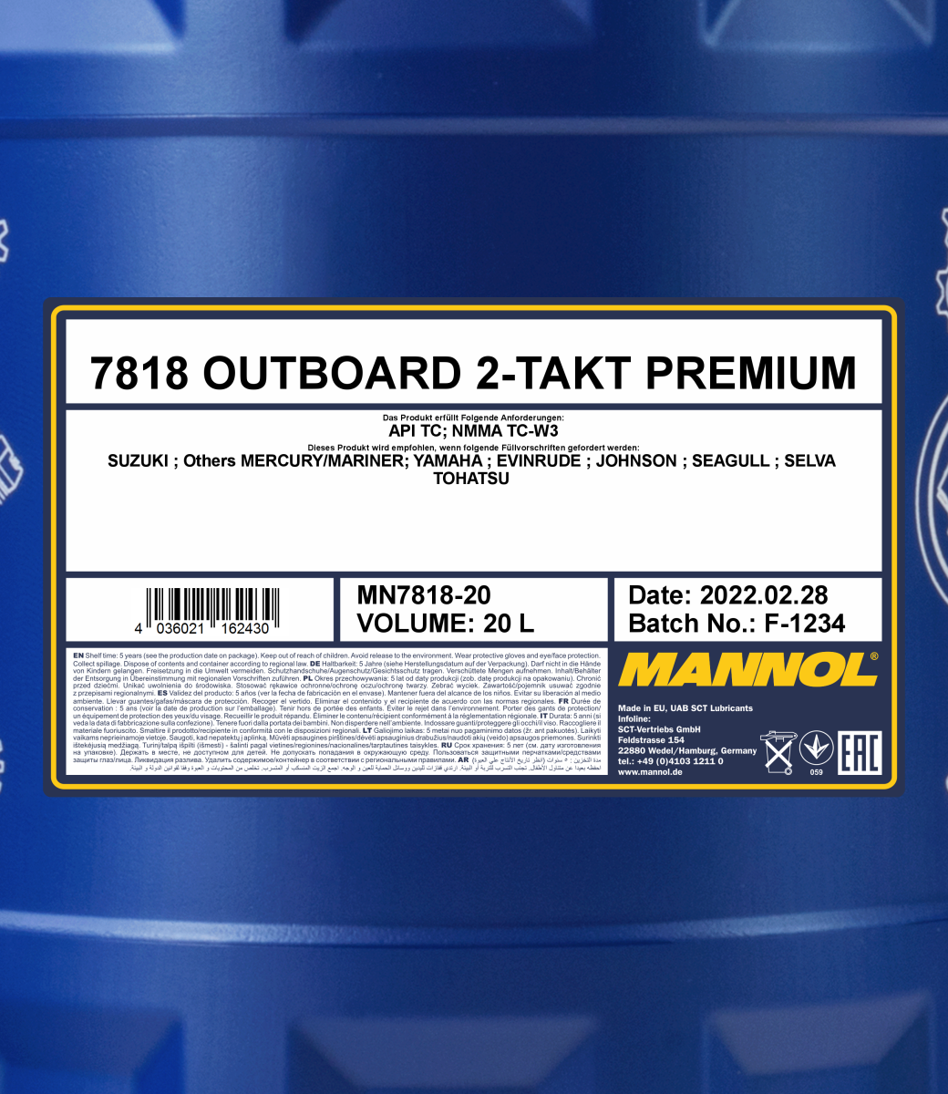 It is designed for 2-stroke outboard Tohatsu, Mercury, Suzuki, Evinrude, Johnson, Mariner, Seagull, Selva and Yamaha engines, as well as for all 2-stroke engines with the required oil level of API TC or NMMA TC W3®.