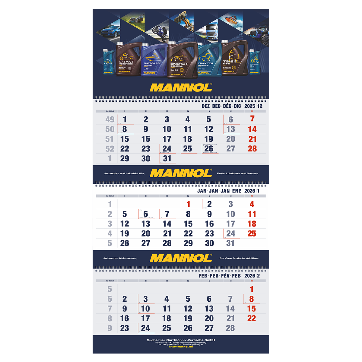 MANNOL 2026 Folding 3-Part Wall Calendar.