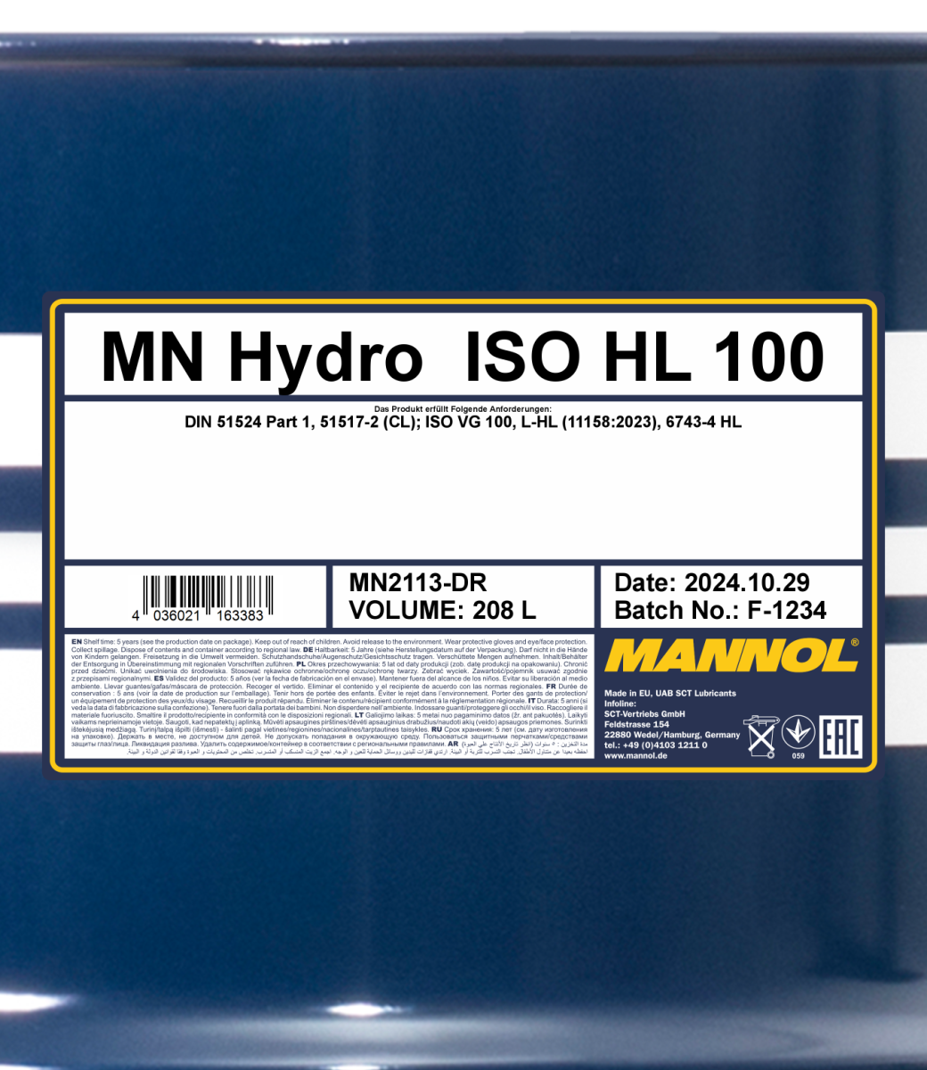 MANNOL Hydro ISO 100 is a high-viscosity mineral hydraulic oil designed for hydraulic equipment of stationary and mobile machinery operating at standard and high operating temperatures. Developed to meet the requirements of industrial hydraulic systems operating at high loads, pressures, temperatures and/or speeds.