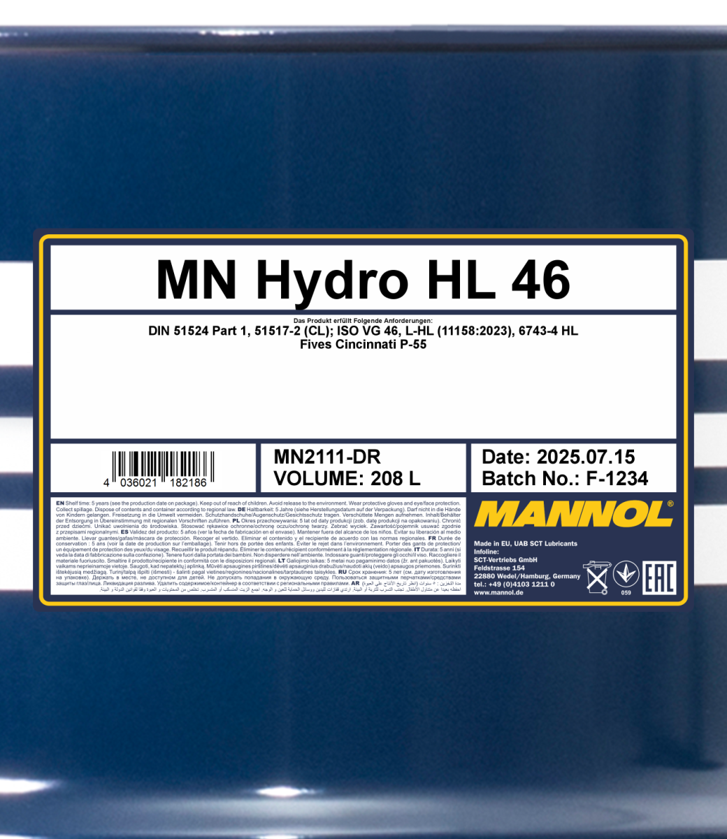 MANNOL Hydro ISO 46 is a medium viscosity mineral hydraulic oil designed for hydraulic equipment of stationary and mobile machinery operating at standard and high operating temperatures. Developed to meet the requirements of industrial hydraulic systems operating at high loads, pressures, temperatures and/or speeds.