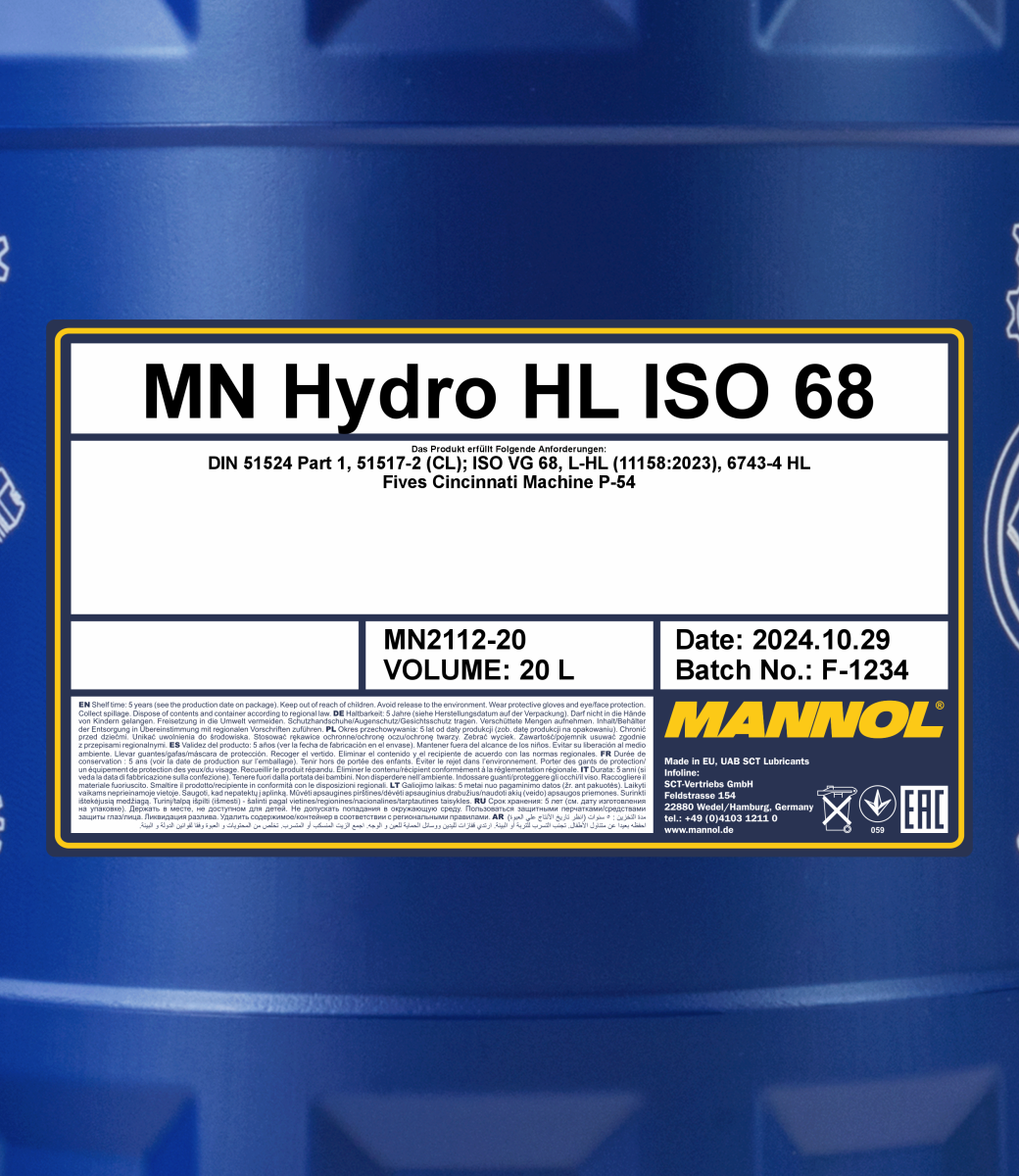 MANNOL Hydro ISO 68 is a medium viscosity mineral hydraulic oil designed for hydraulic equipment of stationary and mobile machinery operating at standard and high operating temperatures. Developed to meet the requirements of industrial hydraulic systems operating at high loads, pressures, temperatures and/or speeds.