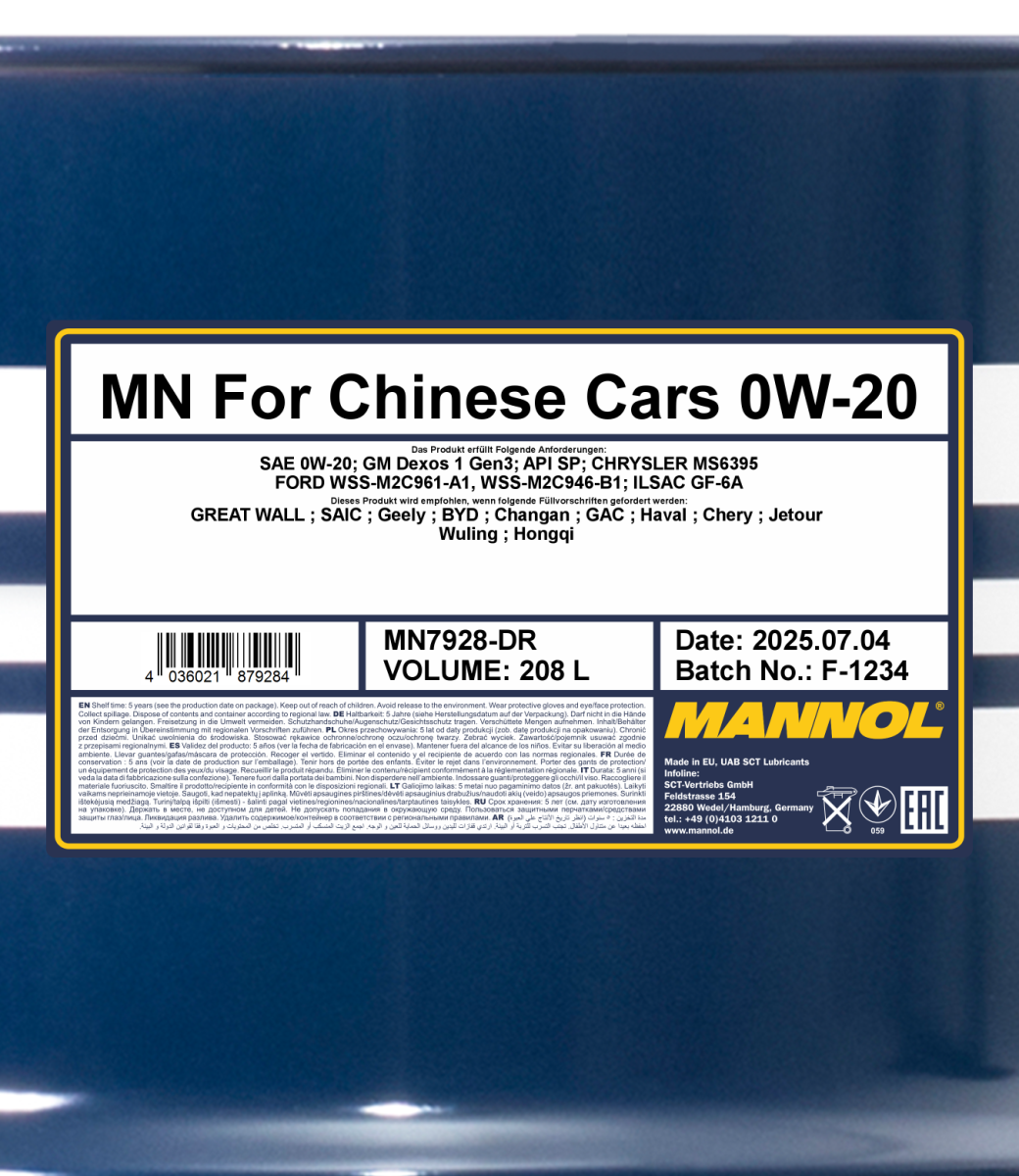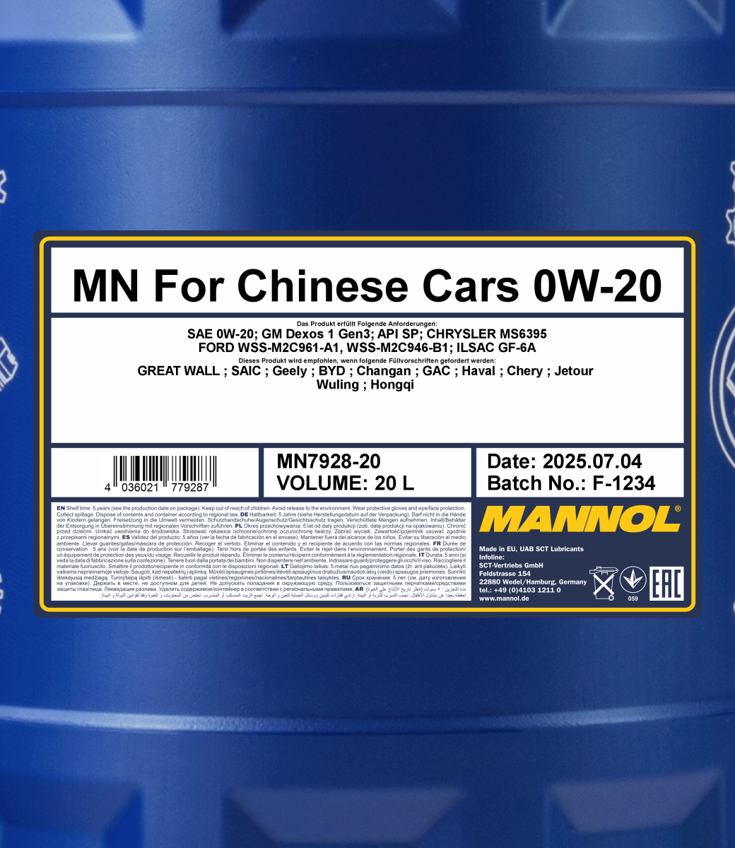 Fully synthetic low-viscosity engine oil for modern petrol engines of passenger cars with direct and multi point fuel injection, turbocharged (TGDI/GDI/TFSI) and non-turbocharged, equipped with variable valve timing (VVT), dual injection and start-stop system. Developed in accordance with the requirements of Chinese car manufacturers. Contains esters.