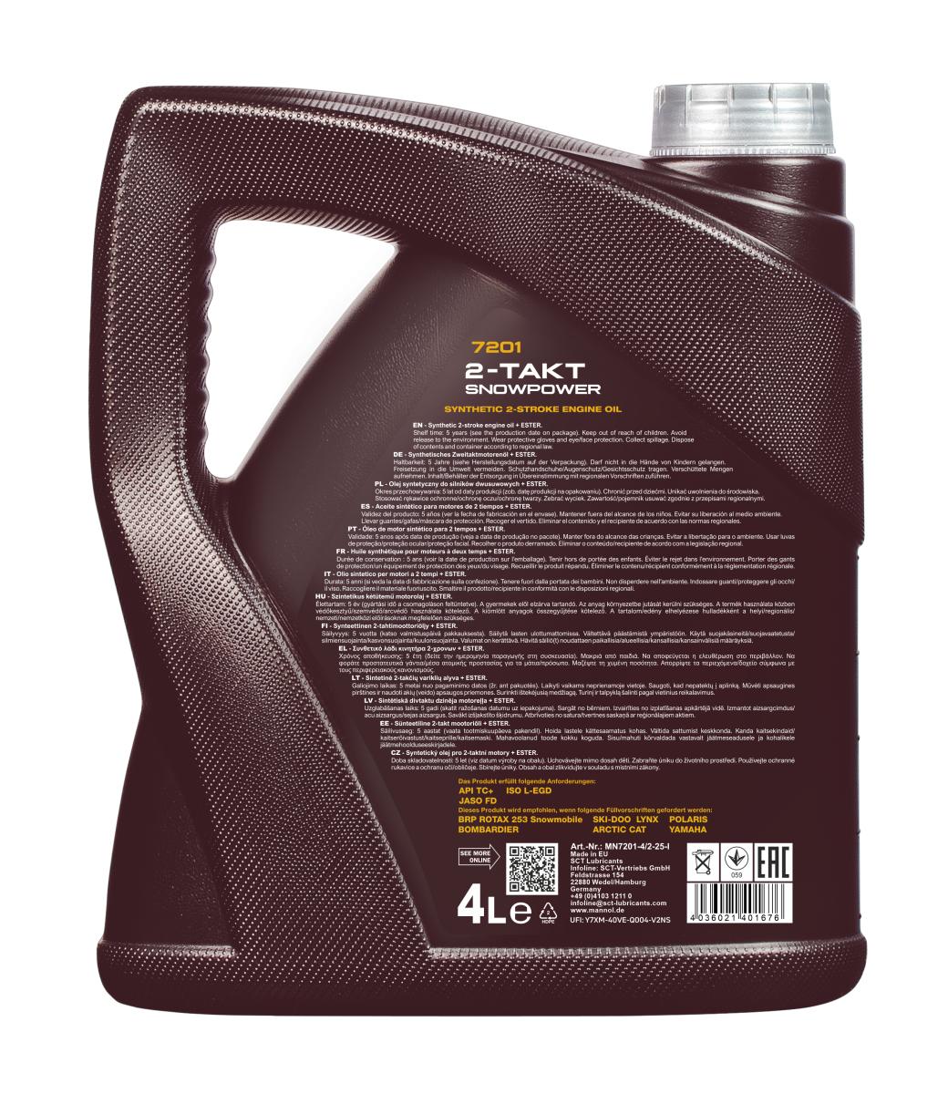 It is designed for two-stroke engines of snowmobiles, utility terrain vehicles, ATVs, scooters and other off-road equipment operating in cold weather whose required oil grade is API TC+ or JASO FD.