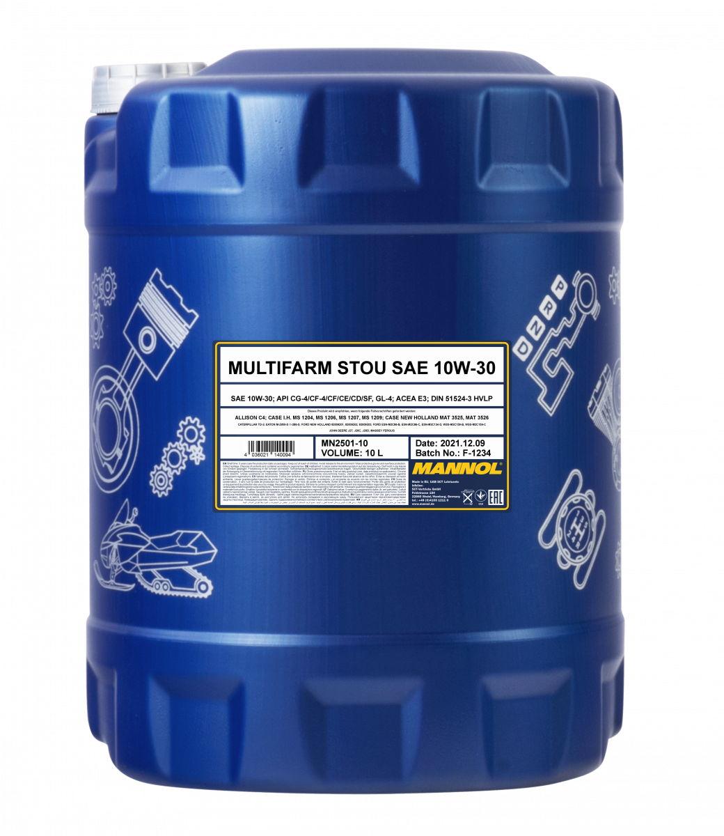 The use of agricultural equipment is characterised by a high dependency of the operation mode and weather conditions, the possibility of a round-the-clock operation, the remoteness from service centres, a wide range of additional attachments and, most commonly, a poor technical competence of the personnel. The use of MANNOL Multifarm STOU 10W-30 eliminates the risk of the equipment issues related to the oil use confusion, when the markings on the containers become illegible due to weather conditions when stored outdoors. The oil use facilitates accounting and storage. In the field, it is enough to take one canister and resolve the issue of adding oil into any piece of equipment in any situation.